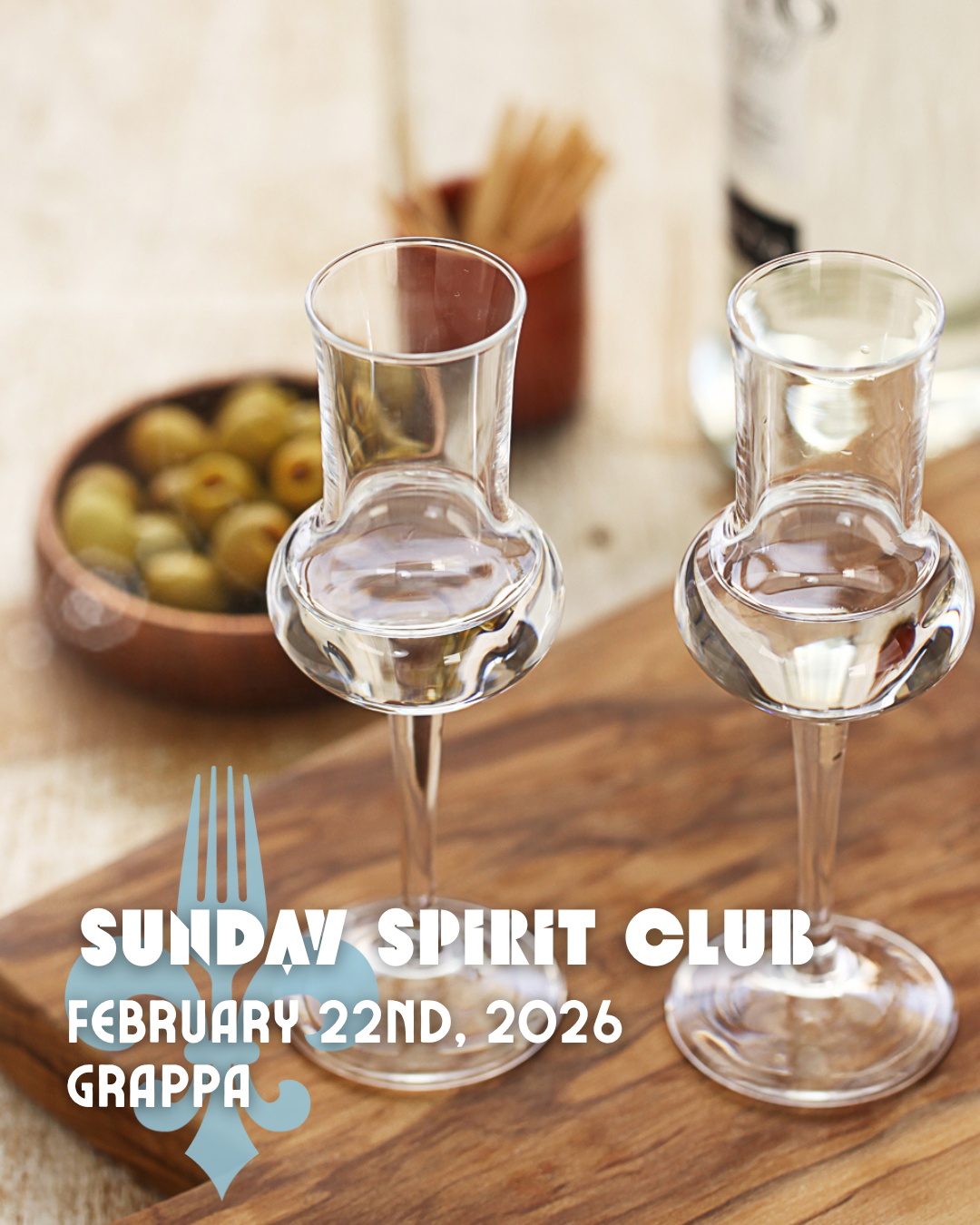 Join us on Sunday, February 22nd for a spirit club featuring a lineup of grappa with our Bar Dad, Mike Chan and Chartier Sous Chef, Greg Lynch.