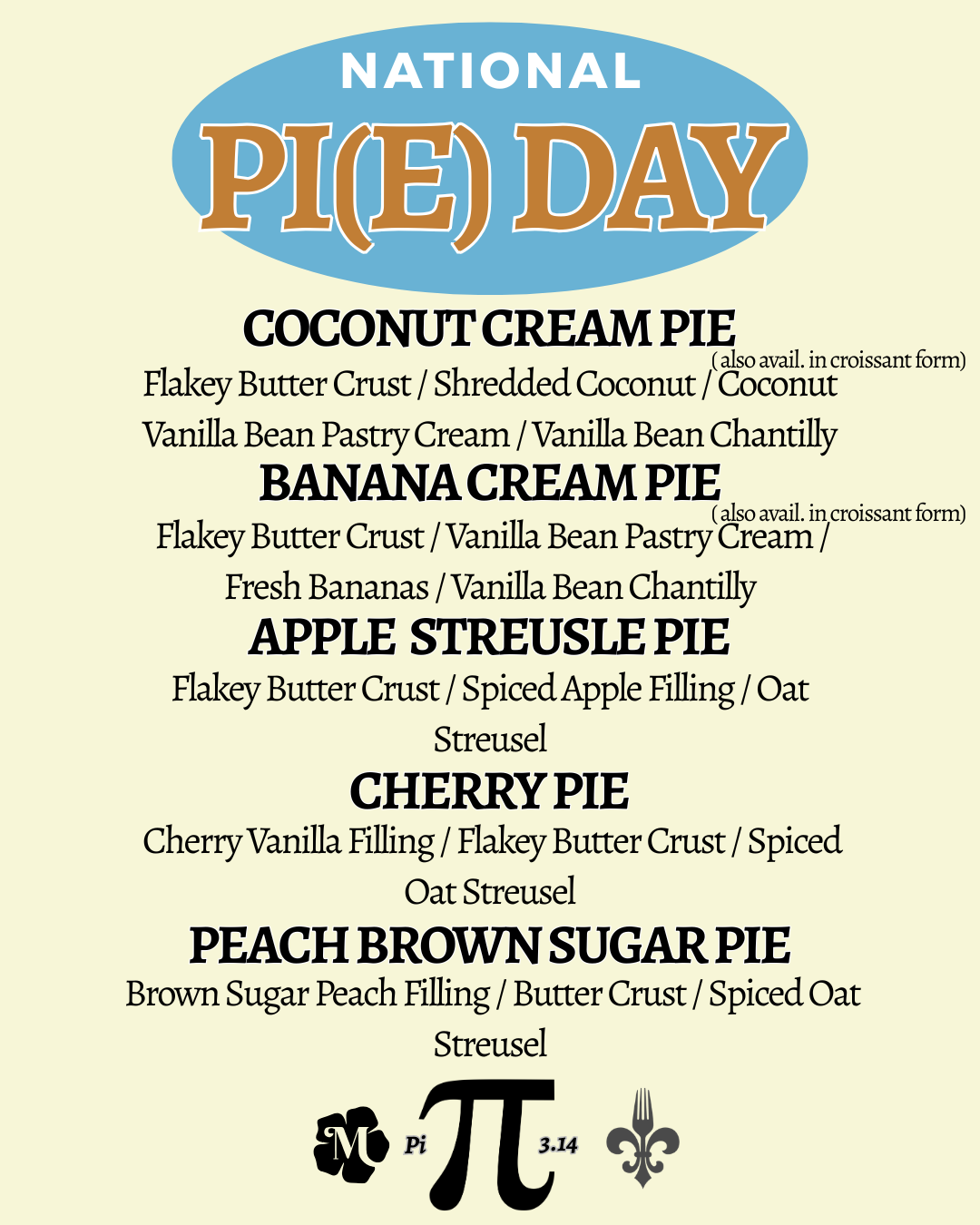 On Saturday, March 14th we’re celebrating Pi day in the best possible way….. with more pie than you can imagine from our bakery - Mother by Chartier.